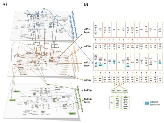 Regulation of the actin cytoskeleton pathway by differentially expressed genes, miRNA, and lncRNA. (A) Integration analysis showing differentially expressed genes (blue squares), differentially expressed miRNAs (brown squares) and their targets (brown broken arrows), and differentially expressed lncRNAs (green squares) and their targets (green broken arrows). Potential interactions between genes, miRNA, and lncRNAs are also shown. (B) Amplification of the list of differentially expressed genes (highlighted in blue), miRNAs and their targets, and lncRNAs and their targets, regulating the actin cytoskeleton pathway.