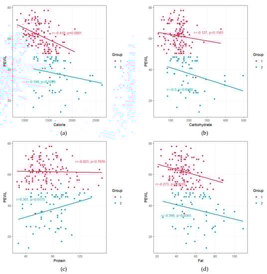 Scatterplot representing the association between %EWL and macronutrient composition at postop 12 months. (a) correlation between %EWL and calorie, (b) correlation between %EWL and carbohydrate, (c) correlation between %EWL and fat, (d) correlation between %EWL and fat. Group 1; Success, Group 2; Failure. P-value was computed by pearson correlation test.