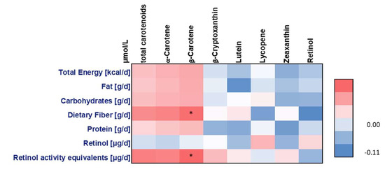 Spearman correlations of calculated food frequency questionnaire-derived nutrient intakes with plasma carotenoid and retinol concentrations; * p < 0.05.