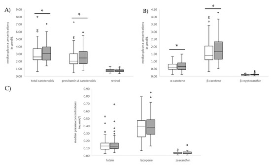 Median plasma: (A) total carotenoid, provitamin A carotenoid, and retinol; (B) provitamin A carotenoid (α-carotene, β-carotene, and β-cryptoxanthin); (C) non-provitamin A carotenoid (lutein, lycopene, and zeaxanthin) concentrations across the genotypes in single nucleotide polymorphism (SNP) rs6564851.TT (white box, n = 89); GT/GG (grey box, n = 100). Data presented as medians and interquartile ranges and were compared by Mann–Whitney U test, * p < 0.05