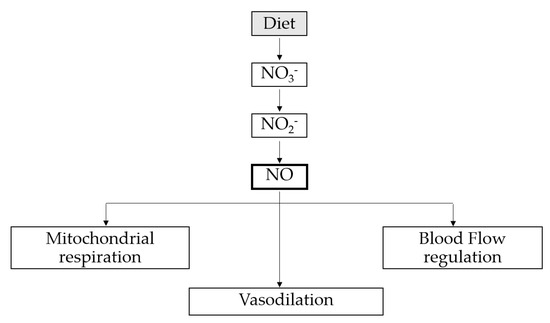 Nitrate supplementation enhances nitric oxide (NO) bioavailability via the NO3–nitrite–NO pathway, which is involved in several physiological processes that could potentially improve skeletal muscle function [1,2]. NO endogenous synthesis occurs through at least two different physiological pathways: the NO synthase (NOS)-dependent and NOS-independent pathways [2]. L-arginine and L-citrulline are the main precursors of NO in the NOS-dependent pathway, while nitrate (NO3−) and nitrite (NO2−) are the main substrates that produce NO via the NOS-independent pathway (Figure 1).