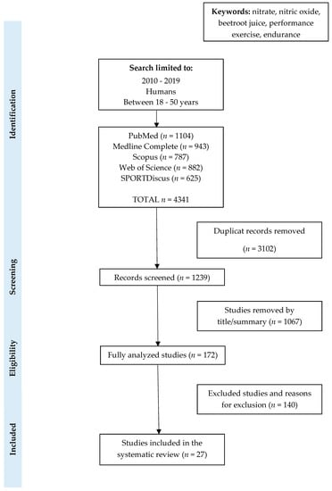 A structured search was carried out following the Preferred Reporting Items for Systematic Review and Meta-Analyses (PRISMA) guidelines [20] in the SCOPUS, Web of Science (WOS), Sport Discus, and Medline (PubMed) databases. The search included original articles with randomized controlled crossover or parallel designs in which the intake of nitrate administered before and/or after the exercise was compared with an identical placebo situation. Due to the increasing number of investigations over the last 10 years interested in using nitrate as a supplement in athletes, the search was bounded from 1 January 2010 to 30 November 2019. Search terms were established matching the Medical Subject Headings (MeSH), as follows: “nitrate,” “nitric oxide,” “beetroot juice,” “performance exercise,” and “endurance.” The connectors OR and AND were also used to filter the search.
