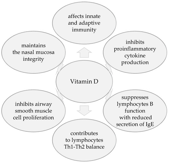 In recent decades, the incidence of respiratory allergic diseases has increased dramatically [1]. Bronchial asthma and allergic rhinitis (AR) have become the most common chronic diseases in childhood [2,3]. This rapid increase is mainly observed in Western countries. There is an urgent need to search for the methods of prevention of allergic diseases from an early age. Intervention options are sought by attempting to modulate environmental factors and lifestyle that have been identified to promote the risk of allergic diseases. Rural environment, microbiome, exposure to allergens and pollution, but also the impact of changes in diet were considered as the main elements. It has been revealed that many dietary components can influence immunological mechanisms of which we will focus here on the role of 25-hydroxyvitamin D (25(OH)D).
