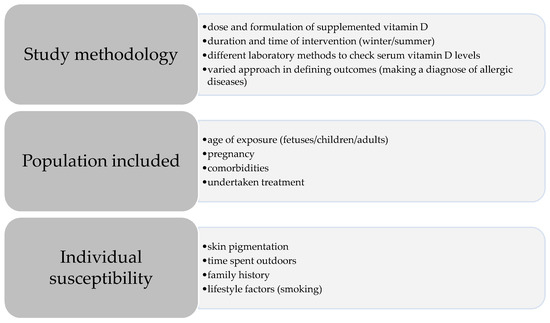 Many clinical and experimental studies suggested vitamin D supplementation as a method of a primary prevention in allergic diseases and asthma. Therefore, the final role of it is still not established and contradictory results have been published. Incompatibilities may arise from different study methodology, different populations included, time of exposure, individual susceptibility, genetic predisposition and many more (Figure 2). Here we discuss some of these aspects.