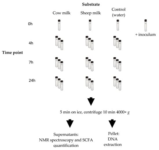 Fermentation dynamics were assessed by sampling at different time points (0, 4, 7, and 24 h). These fermentation time points were selected as practical windows into the colonic digestion of milk, giving a good representation of changes to the microbiome and metabolites concentrations as substrates are progressively utilized, depending on their complexity. The utilization of dairy substrates over similar time frames have been shown in vivo [,]. Separate tubes were prepared for each time point to allow for triplicate sampling throughout the fermentation without disturbing the culture or changing the headspace conditions of the continued fermentation (Figure 1). The fermented liquid of the samples at each time point was cooled on ice for five min, then centrifuged at 4000× g for 10 min at 4 °C. The resulting supernatant was used for the quantification of short-chain fatty acids and analysis by NMR spectroscopy. The pellet was stored at −80 °C and used for DNA extraction.