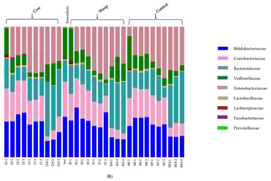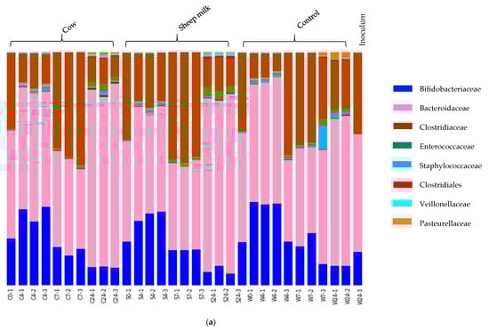 The cultures used as fermentation inoculates were extracted from fecal samples from two infants; a one-month-old infant, who had been fed exclusively on a breast milk diet, and a five-month-old infant, who had been breastfed and was transitioning onto solid food. This transition is reflected in changes to the microbiome as different substrates are introduced by diet variation []. To investigate the effects of feeding sheep and cow milk on infant fecal bacteria at different developmental stages, we used fecal samples from two unrelated infants of different ages. The method for fecal fermentation was based on the methods used by Edwards, et al. [].