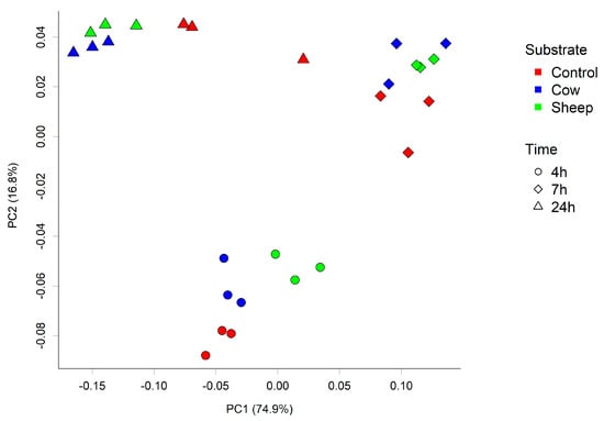 Principal coordinate analysis (PCoA) plot of the fecal microbial community from one-month-old child cultured with cow or sheep milk over 4, 7, and 24 h. PC1 and PC2 refer to principal coordinates 1 and 2 respectively.