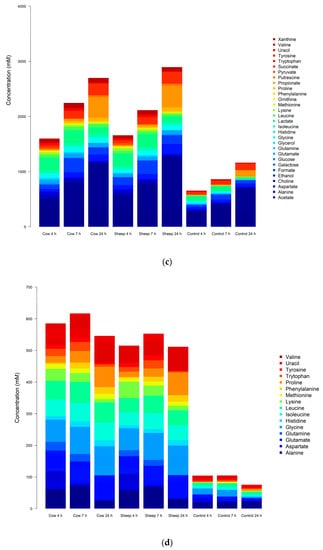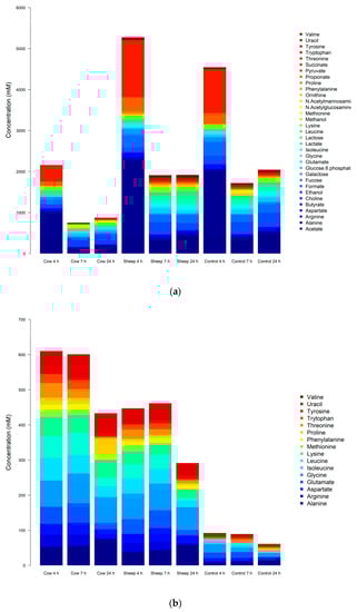 The bacterial utilization of amino acids may also contribute to the decrease in concentrations of most amino acids, as seen clearly at 24 h (Figure 6a,b).