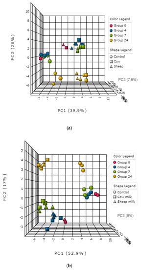 Initially, a PCA scores plot showed separations of the one-month old’s fecal fermentation metabolite profiles by time and between the control and milk fermentation, however, further distinct groupings of cow milk and sheep milk can be seen within the overarching 4 h fermentation group (Figure 5a). A PCA scores plot of the five-month old’s fermentations shows similar results (Figure 5b).