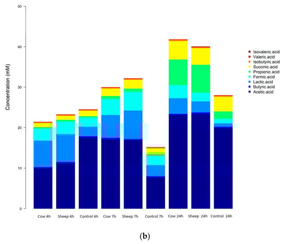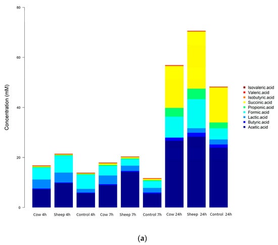 In the one-month old’s fecal fermentations, concentrations of acetic acid were significantly higher (p < 0.05) in sheep milk fermentations than cow milk fermentations, across all time points (Figure 6a). Both sheep and cow milk fermentations also had significantly higher concentrations of acetic acid than the control fermentations across all time points.