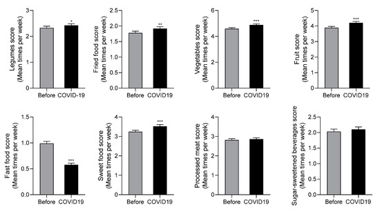 Comparison of average dietary intake among adolescents during COVID-19 confinement (COVID19) and the previous period (Before). Data are means ± SEM. Comparison between groups by paired two-way Student’s t-test. * p < 0.05, ** p < 0.001, *** p < 0.0001. N = 820.