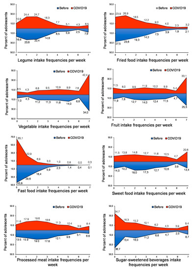 By contrast, fried and sweet food average intakes increased significantly during COVID-19 confinement (Figure 1). Fourteen percent of adolescents consumed sweet food every day before COVID-19, which increased to 20.7% during confinement (Figure 2). Similarly, Figure 2 shows the increase of adolescents who consumed fried foods 4–7 days per week, from 7.4%, 3.7%, 1.8% and 2.1% before to 8.8%, 3.8%, 2.2% and 2.9% during confinement. These results confirm previous studies that suggested that the confinement could lead to irregular eating patterns and frequent snacking in adolescents due to boredom and stress [17,18]. It is also important to highlight that these dietary habits are associated with a higher caloric intake and an increased risk of obesity [19].