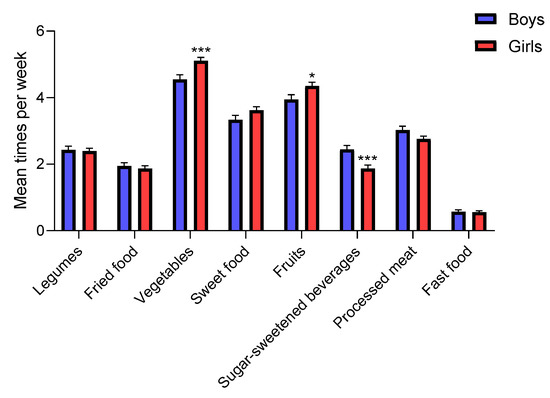 The gender classification results show that females significantly increased their vegetable (from 4.8 before to 5.1 times per week, p < 0.0001) and fruit intake (from 4.0 before to 4.4 times per week, p < 0.0001) during confinement (Table 2). On the other hand, males also showed an increase in vegetable consumption (from 4.0 before to 4.4 times per week during COVID-19, p = 0.0007), and processed meat intake (from 2.9 before to 3.0 time per week during COVID-19, p = 0.0182) but did not change their average fruit consumption (Table 2). Moreover, when comparing the average food intake by gender, we confirm that girls consumed significantly more fruits and vegetables during COVID-19 confinement and fewer SSB than boys, in our survey (Figure 3). These results are in concordance with previous observational studies about nutritional behaviors and differences between sexes [21].