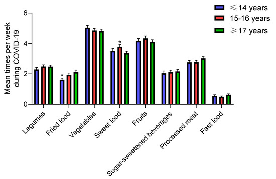 Only adolescents over the age of 14 significantly increased vegetable and fruit intake during COVID-19 confinement versus before confinement (Table 2). Adolescents under the age of 14 significantly increased the average consumption of fried and sweet foods (from 1.3 and 3.2 before to 1.6 and 3.5 during the COVID-19 pandemic, respectively; p = 0.0025 and p = 0.0386) (Table 2). It is important to note that we recorded a dramatic increase in sweet food consumption in those over 17 years of age due to COVID-19 confinement (p = 0.001), but all teens, regardless of age, consumed sweets 3 to 4 times per week. There were no differences in adolescents’ mean food intake during COVID-19 confinement by age (Figure 4), but we found significant differences by age in legume, fried food, vegetable and fast food average intake during confinement compared with the recommended dietary allowance (legumes: 3 or 4 servings per week [24], fried food: occasional [14], vegetables: diary [25] and fast food: occasional [26,27,28] (Table 3). However, in relation to age, no significant association with dietary patterns was identified, possibly because the sample consisted only of adolescents and with a low range of age variation (10 to 19 years).