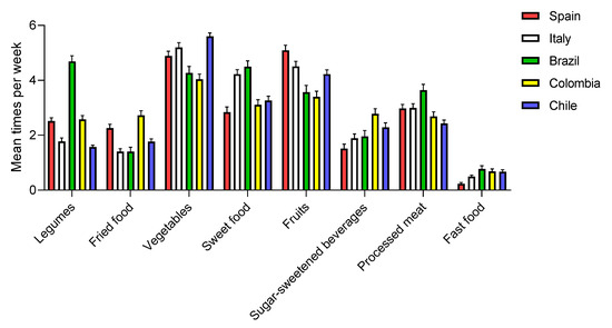 Mean dietary intake among adolescents during COVID-19 confinement by country. Data are means ± SEM.