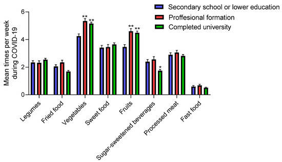 Mean dietary intake among adolescents during COVID-19 confinement by maternal education. Data are means ± SEM. Comparison between groups by paired two-way ANOVA. * p < 0.001, ** p < 0.0001 compared to secondary school or lower education group.