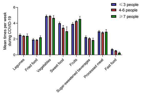 Mean dietary intake among adolescents during COVID-19 confinement by family members. Data are means ± SEM. Comparison between groups by paired two-way ANOVA. * p < 0.001 compared to the ≤3 people group.