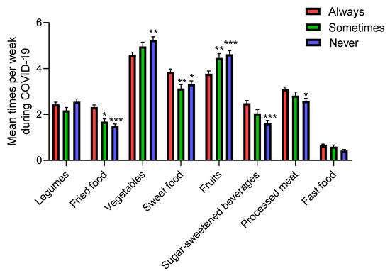 Mean dietary intake among adolescents during COVID-19 confinement by viewing TV during mealtimes. Data are means ± SEM. Comparison between groups by paired two-way ANOVA. * p < 0.05, ** p < 0.001, *** p < 0.0001 compared to the Always group.