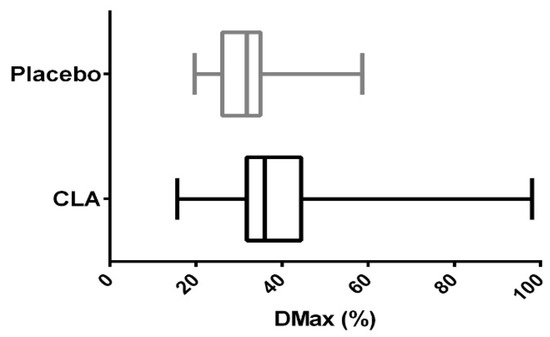 Maximum momentary 13C recovery (Dmax) in subjects receiving conjugated linoleic acid (CLA) and placebo after 12 weeks of nutritional intervention (p = 0.0076).
