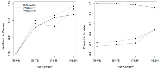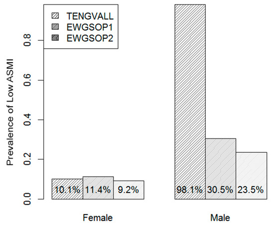 Figure 2 shows the gender-specific prevalence of low ASMI under each diagnostic criterion. Several realizations can be derived from the presented plots. Under all diagnostic criteria, the prevalence of low ASMI for males was consistently higher than for females. Specifically, old males were more than twice as likely to be diagnosed as sarcopenic than females under the EWGSOP criteria. On the other hand, the vast majority of males in the study sample (98.1%) were diagnosed as sarcopenic under the Tengvall criterion, with a prevalence that was more than three times as high as the prevalence of low ASMI for males under the other two diagnostic criteria. The latter realization confirms an inconsistency between the Tengvall and EWGSOP diagnostic criteria for males. However, this was not the case for females; the prevalence of low ASMI for females was comparable among the three diagnostic criteria.