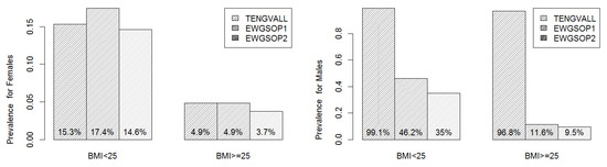 On the other hand, under the EWGSOP criteria, the prevalence of low ASMI for overweight or obese males was at least 35% and was notably lower than the prevalence of low ASMI for underweight or normal males (less than 12%). However, when the Tengvall criterion was considered almost all male subjects were with low ASMI. Interestingly, this exaggeration behavior of Tengvall diagnostic criterion for men was evident among both BMI-based comparing groups.