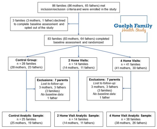 - Haines, J.; Douglas, S.; Mirotta, J.A.; O’Kane, C.; Breau, R.; Walton, K.; Krystia, O.; Chamoun, E.; Annis, A.; Darlington, G.A.; et al. Guelph Family Health Study: Pilot study of a home-based obesity prevention intervention. Can. J. Public Health 2018, 109, 549–560. [Google Scholar] [CrossRef]