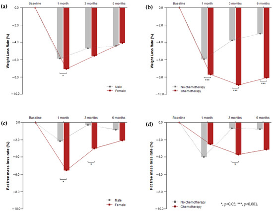 Change in weight/fat-free mass loss rate after gastrectomy according to gender and chemotherapy. (a) The difference in weight loss rates between males and females was statistically significant at one month after surgery (p = 0.012); (b) chemotherapy showed a significant effect on the weight loss rate over the entire postoperative period (p < 0.001); (c) the difference in the fat-free mass loss rates between males and females was statistically significant at one and three months after surgery (p = 0.006 and 0.033, respectively); (d) chemotherapy showed a significant effect on the fat-free mass loss rate at three months after surgery (p = 0.042).