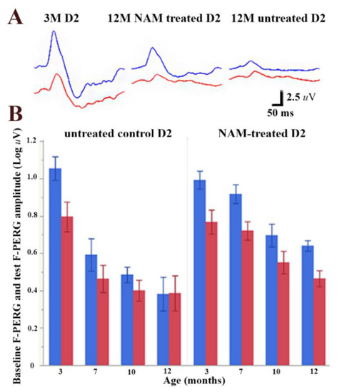 Figure 1A shows representative waveforms of baseline F-PERG (PERG with superimposed 101 Hz flicker, in blue) and test F-PERG (PERG with superimposed 11 Hz flicker, in red) of 3-month-old D2 mice; baseline and test F-PERG of 12-month-old untreated D2 mice; baseline and test F-PERG of 12-month-old D2 mice fed daily with NAM-enriched diet supplement. Note that the baseline F-PERG of the 12-month-old untreated mouse is much reduced compared to the baseline F-PERG of the untreated 3-month-old mouse, whereas the F-PERG amplitude of the NAM-treated mouse is about twice that of the untreated 12-month-old mouse. Figure 1B shows age-related changes of mean baseline F-PERG amplitude (blue bars) together with corresponding mean amplitudes of test F-PERG (PERG with superimposed 11 Hz flicker: red bars). Note that the baseline F-PERG and the test F-ERG decrease with increasing age (RM-ANOVA, p < 0.0001) in both untreated and NAM-treated mice. However, for both baseline F-PERG and test F-PERG, the amplitude decline with age was substantially shallower in an NAM-treated group compared to the control group (interaction between baseline F-PERG amplitudes and treatment, p = 0.0135). At the endpoint, the difference between baseline and test F-PERG (F-PERG adaptation) was abolished in control D2 mice while preserved in NAM-treated D2 mice (interaction between F-PERG adaptation and age, p = 0.0165). We considered a possible role of IOP in the difference of flicker-induced PERG adaptation between control and NAM-treated B2 mice. The average IOP over the observation period was 19.0 mmHg (SE 0.98) in untreated D2 and 17.7 mmHg (SE 0.83) NAM-treated D2 (p = 0.29), in agreement with a previous report that NAM-treatment does alter IOP in D2 mice [10].