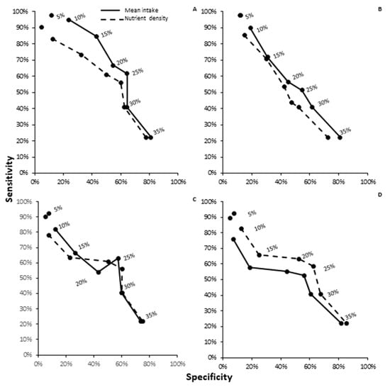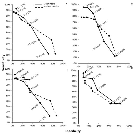 Fisher’s exact test was used to compare dietary assessment methods against hematological outcomes. From the table analysis, sensitivity, specificity, PPV, and NPV were calculated for each nutrient by each hematological cutoff value. Mean dietary estimates and food pattern modeling method sensitivity and specificity were plotted for ROC curve analysis. The calculated response elements for each dietary analysis method were compared by a Student paired T-test, using p < 0.05 as a cutoff for significant differences between methods.