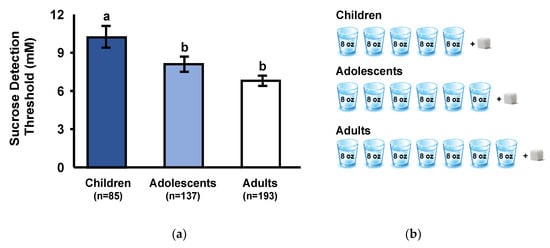 (a) Sucrose taste detection thresholds: concentration of sucrose (mM) at which children, adolescents, and adults detected a taste different from water. There was a significant effect of age group (p < 0.001). Different subscripts represent groups that are significantly different from each other at p < 0.05. Values are presented as GeoMeans ± GeoSE (see Section 2.4 for explanation). (b) To illustrate the age-related differences in sucrose detection thresholds, we converted millimolar concentrations of each age group to the number of 8-ounce (230 mL) glasses of water required to dilute one 4 g sugar cube, in all cases we rounded up.