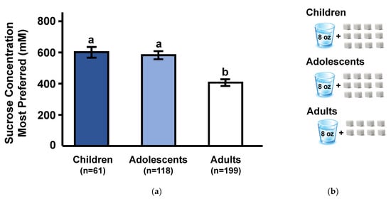 (a) Sucrose concentration (mM) most preferred among children, adolescents, and adults. There was a significant effect of age group (p < 0.001). Different subscripts represent groups that are significantly different from each other at p < 0.05. Values are means ± SEM (see Section 2.4 for explanation). (b) To illustrate the age-related differences in most preferred sucrose concentration, we converted millimolar concentrations of each age group to number of 4 g sugar cubes required per one 8-ounce (230 mL) glass of water, in all cases we rounded up.