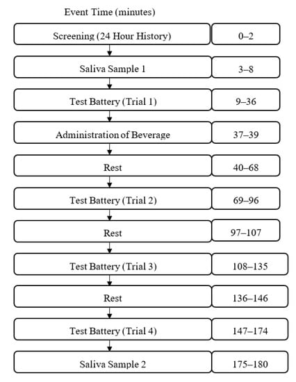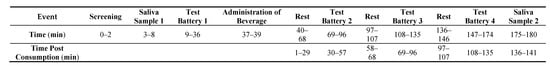 After participants were screened for eligibility on the day of testing, they were asked to accumulate saliva at the bottom of their mouth and use a plastic drinking straw to drool 2 mL of saliva into a 10 mL test tube. Baseline measures of sustained attention (the mental energy test battery), motivation, mood, blood pressure (BP), heart rate (HR), and fine motor task performance were obtained next (Figure 1). After the completion of baseline testing, participants were administered the beverage and instructed to consume it within two minutes. Following the administration of the beverage, participants were given a 28-min break but were not allowed to participate in strenuous physical or mental activity or consume additional snacks or beverages. Three additional 27-min mental energy battery tests were completed and punctuated by 10-min rest breaks as shown in Figure 2. Finally, participants provided a post-test saliva sample using the drool down method. The timing of the mental energy test battery, mood and physiologic measures is presented in Figure 3.