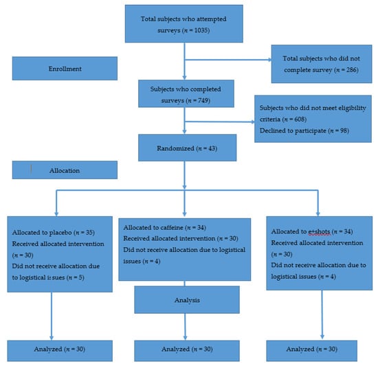 Participant exclusion criteria included: (i) were under the age of 18 or over the age of 45, (ii) a self-reported body mass index (BMI) > 30, (iii) above average feelings of energy (scores > 12) during the week prior to the screening using the vigor scale of the 30-item Profile of Mood States-Short Form (POMS-SF) questionnaire []. The rationale for this cut-off was that a “ceiling effect” may occur with this particular measure. Since the POMS-SF vigor scale only measures vigor scores up to 20, including subjects who already display above average feelings of energy would likely minimize any potential energizing influences of either caffeine or e+ shot. (iv) high caffeine consumers (>21 servings of 170.5–341 mL caffeine beverages per week) [], (v) high consumption of polyphenols (>100 total combined servings of cocoa, caffeine, fruits or vegetables high in flavanols) [], (vi) reported a chronic health condition requiring prescription or over-the counter medication (excluding contraception) on a continual basis, (vii) were pregnant or reported a chance of being pregnant, (viii) had a heart condition, high blood pressure, gastrointestinal (GI) tract disorder, bipolar disorder, or allergy to caffeine (x) were current smokers, and (xi) consumed nutritional supplements (i.e., herbs, vitamins, or creatine; not including supplementation of protein without caffeine).