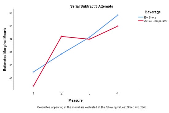 When compared to e+ shot, the comparator elicited a greater () increase in serial subtract 3 attempts compared to the e+ shot () (F = (1, 55) = 10.123, η2 = 0.156, unadjusted p = 0.002, adjusted p = 0.006), 30 min post-consumption. Serial subtract 3 total attempts also exhibited significance (F(3,162) = 2.867, η2 = 0.050, unadjusted p = 0.038, adjusted p = 0.114) when considering all four time points, with e+ shot showing steady upward trends in total attempts while caffeine promoted a significant increase 30 min post-consumption with subsequent tapering off (Figure 5). Significant differences (F(1, 57) = 4.917, η2 = 0.081, unadjusted p = 0.031, adjusted p = 0.093) were also noted in diastolic blood pressure when comparing e+ shot to caffeine 30 min post-consumption.