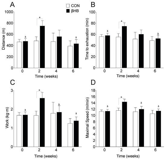 Figure 1. Effect of β-hydroxybutyrate supplementation on physical performance. (A) Running distance. (B) Time to exhaustion. (C) Vertical work. (D) Maximal speed. n = 8–14 mice per condition. * p < 0.05 between CON and β-HB; δ, p < 0.05 compared to the second week within the β-HB group. Two-way ANOVA repeated measurements with Bonferroni′s post hoc test. Values expressed as mean ± SEM.