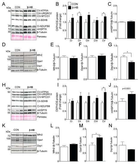 Figure 2. Six weeks of β-HB intake alter the electron transport chain and mitochondrial dynamics protein levels. (A) Representative OXPHOS Western blot from Tibialis anterior whole tissue extract. (B) Tibialis Anterior OXPHOS quantification. (C) mHsp70 levels. (D) Tibialis anterior mitochondrial fission and fusion proteins representative Western blot. (E) Mfn2. (F) Opa1 and (G) Drp1. (H) Soleus representative OXPHOS Western blot. (I) Soleus OXPHOS quantification. (J) mHsp70. (K) Soleus mitochondrial fission and fusion proteins representative Western blot. (L) Mfn2. (M) Opa1 and (N) Drp1. The grouping of blots cropped from different parts of the same gel were divided by black lines. n = 5–6 mice per condition, * p < 0.05, Unpaired t-Test. Values expressed as mean ± SEM.