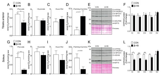 Since we observed an increase in running capacity in the β-HB-supplemented mice after two weeks of treatment, as shown in Figure 1, we wanted to determine if these changes are related to modifications in mitochondrial function in response to short-term exposure to β-HB. Using SkM permeabilized fiber bundles (PmFB), we assessed the differences in O2 consumption and substrate oxidation after short-term β-HB intake, as shown in Figure 3. TA showed a significant decrease in pyruvate-sustained respiration, as shown in Figure 3A, and no changes in the presence of succinate, as shown in Figure 3B, or succinate plus complex I rotenone inhibitor, as shown in Figure 3C, or with palmitoyl-carnitine, as shown in Figure 3D, compared to CON. Interestingly, no changes in OXPHOS subunit protein content were observed in TA, as shown in Figure 3F. Similar to TA, the SOL SkM fibers presented a significant decrease in pyruvate oxidation, as shown in Figure 3G, and no changes in succinate or succinate plus rotenone, as shown in Figure 3H,I. No change in oxygen consumption was observed in the presence of palmitoyl–carnitine oxidation in SOL in the β-HB supplemented group compared to CON, as shown in Figure 3J. In contrast to TA, SOL OXPHOS subunits CI, CII, and CIII presented a significant decrease, compared to the non-supplemented group, as shown in Figure 3L.