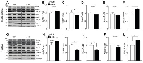 Figure 4. β-Oxidation and β-hydroxybutyrate oxidation protein content are altered mainly on SOL after a two-week β-hydroxybutyrate intake. Bar graphs represent mean band intensity. (A) Representative Western blot for tibialis anterior. (B) Cpt1b. (C) Vlcad. (D) Scad. (E) Acca2. (F) β-HB utilization rate-limiting enzyme Scot. (G) Representative Western blot for Soleus. (H) Cpt1b. (I) Vlcad. (J) Scad. (K) Acca2. (L) β-HB utilization rate-limiting enzyme Scot. The grouping of blots cropped from different parts of the same gel were divided by black lines. n = 4–6 mice per condition, * p < 0.05, ** p < 0.01, *** p < 0.001, Unpaired t-Test. Values expressed as mean ± SEM.