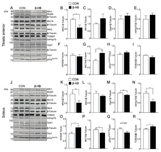 Based on the small changes we observed in mitochondrial fission and fusion proteins at the end of the six-week treatment, as shown in Figure 2, we determined if the peak of performance time observed after two weeks of β-HB supplementation was related to changes in these proteins. In TA muscle, as shown in Figure 5, Mfn2 levels decreased significantly compared to CON, as shown in Figure 5B, while Mfn1, as shown in Figure 5C, and Opa1 levels remained unchanged, as shown in Figure 5D. Mitochondrial fission protein Drp1 also showed no change in phosphorylation status measured by pDrp1Ser616, as shown in Figure 5H. Furthermore, no differences were observed in mitochondrial mass assessed by mHsp70, as shown in Figure 5E, or TOM20, as shown in Figure 5I. In the SOL muscle of β-HB-fed mice, as shown in Figure 5J, Mfn2 and Opa1, as shown in Figure 5K,M, significantly decreased compared to CON, and no changes on Mfn1 were observed, as shown in Figure 5L. Interestingly, mHsp70 protein levels were lower in SOL from β-HB-fed mice, as shown in Figure 5N, while TOM20 showed a mild increase, as shown in Figure 5R.
