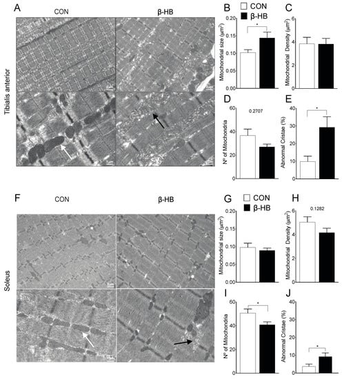 Figure 6. Short-term β-hydroxybutyrate diet alters mitochondrial morphology. Tibialis anterior: (A) Representative electron microscopy of both groups. (B) Mitochondrial size μm2. (C) Mitochondrial density (%). (D) Mitochondria number. (E) Abnormal cristae. Soleus: (F) Representative electron microscopy of both groups. (G) Mitochondrial size μm2. (H) Mitochondrial density (%). (I) Mitochondria number. (J) Abnormal cristae. * p < 0.05, Unpaired t-Test. Values expressed as mean ± SEM. >15 mitochondria per fiber, >4 animals per condition. Scale bars: 1 and 2 μm, as indicated. The white arrows indicate normal and the black arrows abnormal mitochondria.