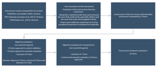 Summary of the construction, content validation and semantic evaluation process of the food neophobia instrument in children in Brazilian–Portuguese.