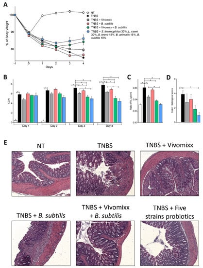 The severity of the TNBS-induced colitis was assessed daily by monitoring changes in body weight and colitis disease activity index (CDAI) and colonic macroscopic and microscopic features at the time of sacrifice. The data shown in Figure 1 highlight the protective effect of Vivomixx®, as already shown in previous studies [33]. However, the best beneficial effect was obtained by dosing the mice with the Five strains probiotics, which effectively attenuated the body weight loss by ≈15% and the CDAI by 45% at day 4 compared with the group treated with TNBS alone (Figure 1A,B). Furthermore, the Five strains probiotics improved the macroscopic and microscopic features of the colitis (Figure 1C–E). The combination of Vivomixx® with Bacillus subtilis, one of the components of the Five strains probiotics mixture, heighted the beneficial effects exerted by Vivomixx® alone, without matching the effects exerted by the Five strains probiotics (Figure 1). Conversely, the administration of a formulation consisting of Bacillus subtilis alone exerted a minor beneficial effect (Figure 1).