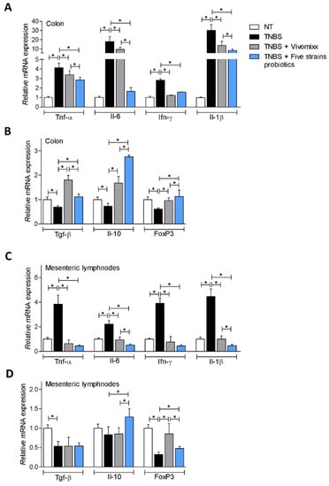 These data were confirmed by the analysis of the expression of pro- (Tnf-α, Il-6, Ifn-γ and Il-1 β) and anti-inflammatory (Tgf-β, Il-10 and FoxP3) biomarkers in the colon and mesenteric lymph nodes (mLN) of mice rendered colitic by TNBS and treated with Vivomixx® or with the Five strains probiotics (Figure 2). The results of these assays demonstrated that while exposure to TNBS alone increased the expression of pro-inflammatory mediators Il-6 (≈20 folds) and Il-1β (≈30 folds) (Figure 2A), this pattern was reversed by both probiotic formulations. Furthermore, the Five strains probiotics was significantly more effective than Vivomixx® in reducing the level of Il-6 (Figure 2A). Both probiotic formulations increased the expression of anti-inflammatory genes Tgf-β, Il-10 and FoxP3 (Figure 2B). Furthermore, both probiotic formulations reduced the expression levels of the pro-inflammatory cytokines and increased the expression of FoxP3 in the mesenteric lymph nodes. In contrast, none of the treatments had any effect on Tgf-β expression, but the novel formulation increased Il-10 gene expression (Figure 2C,D).