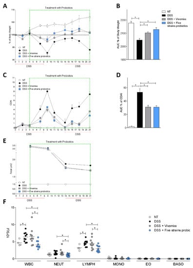 Effects of probiotics on chronic colitis. The experiment was carried out on BALB/c mice. Mice were treated with DSS in drinking water for two cycles of 7 days each and then administered with vehicle or one of the different formulations of probiotics by gavage from day 4 to the end of the experiment. Data shown: changes in body weight (A), area under the curve (AUC) of % of body weight (B), CDAI (C) and area under the curve of CDAI (D) during the course of DSS-induced colitis. Lipocalin 2 levels in stool at different time points (E). Blood cells counted at the end of experiments (day 21) (F). Results are the mean ± SEM of 7-11 mice per group. * p < 0.05.