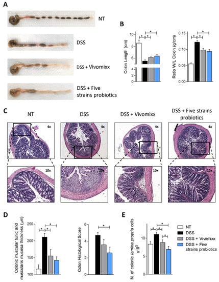Effects of Vivomixx® and the Five strains probiotics on macroscopic and microscopic characteristics of the colon. BALB/c mice were treated with DSS in drinking water for two cycles of 7 days each and then administered with vehicle or one of two probiotics formulations by gavage from day 4 to the end of the experiment. Photographs of colon from control, DSS-treated and DSS plus Vivomixx® and Five strains probiotics-treated mice (A), colon length and ratio of colon weight/colon length (B). H&E staining of colon sections from each experimental group (original magnification ×4 and ×10) (C). Evaluation of wall thickness and histological score (D), and number of lamina propria cells (E). Results are the mean ± SEM of 7–11 mice per group. * p < 0.05.