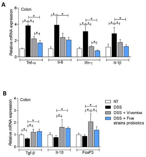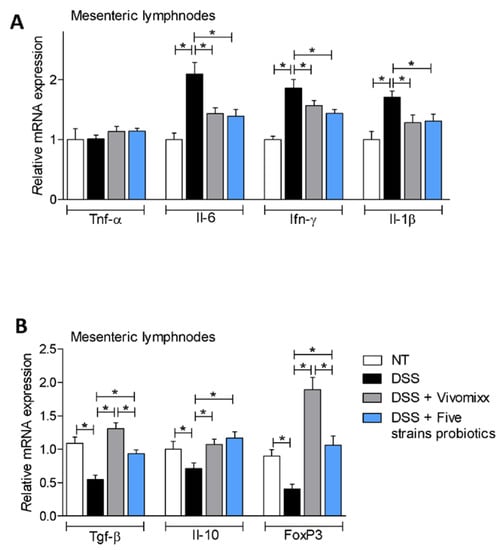 Analysis of the expression of pro- and anti-inflammatory genes in the mesenteric lymph nodes were consistent with these findings (Figure 8A,B), as the two probiotic formulations reversed the pro-inflammatory pattern caused by treating mice with DSS. Additionally, both probiotics increased the expression of anti-inflammatory genes Tgf- β, Il-10 and FoxP3 (Figure 8A,B).