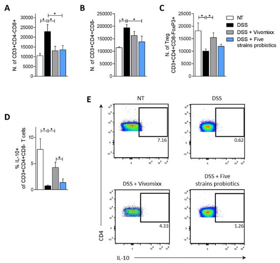 Furthermore, a detailed flow cytometry analysis of lamina propria-infiltrating cells (Figure 6, Figure 7 and Figure S1) demonstrated that both probiotic formulations effectively reduced the number of CD8+ T cells (CD3+CD4-CD8+) and CD4+ T helper cells (CD3+CD4+CD8-) (Figure 6A,B), but had no significant effect on the percentage of these cells (Figure S1A,B). Next, we have also investigated the effects of the two formulations on modulating T helper cell subsets. The results of this analysis demonstrated that only Vivomixx® increased the number of lamina propria (CD3+CD4+CD8-FoxP3+) Treg cells (Figure 6C) and the percentage of IL-10+ T helper cells (CD3+CD4+CD8-IL-10+) (Figure 6D,E).