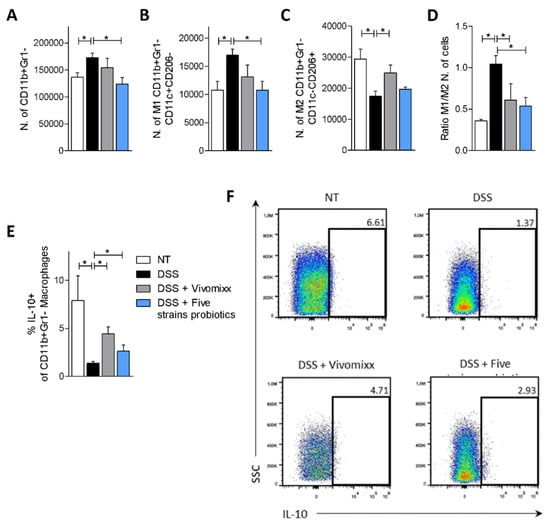 We have then investigated the effect of in vivo treatment with probiotics on macrophages, the largest population of immune cells most found in the lamina propria of the colon [42,43] (Figure 7). Of interest, both formulations of probiotics reduced the number of total macrophages (CD11b+Gr1-) and the number of M1 subsets (CD11b+Gr1-CD11c+CD206-) detected in the colon of mice administered DSS (Figure 7A,B). However, only the Five strains probiotics had a statistically significant effect (Figure 7A,B). In contrast, we were unable to detect change either on the percentage of total marginalized macrophages in the lamina propria or on the percentage of the M1 subpopulation (Figure S1D). On the other hand, both probiotic mixtures increased the number and the frequency of M2 macrophages (CD11b+Gr1-CD11c-CD206+) and the percentage of IL-10+ macrophages as demonstrated by the decrease in the ratio of M1/M2 macrophages (Figure 7C–F and Figure S1D). Together, these data suggest that Vivomixx® exerted a greater effect in inducing the expansion of anti-inflammatory macrophages if compared with the Five strains probiotics (Figure 7C–F).