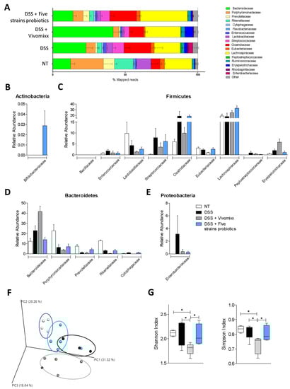 Effects of probiotic formulations on microbiome composition. The experiment was carried out on BALB/c mice. Mice were treated with DSS in drinking water for two cycles of 7 days each and then administered with vehicle or probiotics by gavage from day 4 to the end of the experiment. Stool samples were collected at the end of the experiment (day 21). The gut microbiota composition profiles at family level expressed as percentage of mapped reads (A) and detailed graphs of the most represented families grouped by phylum (B–E). Plot of principal coordinate analysis (PCoA) of fecal microbiota using the Bray–Curtis dissimilarity matrices at family levels (F). Shannon and Simpson indices used to estimate the α-diversity of fecal microbiota (G). Results are the mean ± SEM of 5 mice per group. * p < 0.05.