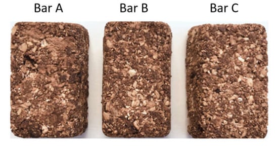 Symptoms were assessed at baseline and after 4 weeks using the validated Nepean Dyspepsia Index (NDI) [22]. A food frequency questionnaire was used to calculate the change (mean, grams per day) in FODMAP intake over the run-in diet period [21], and a validated questionnaire was used to ensure compliance with the gluten-free aspect of the diet [23] (Figure S2). Those with a significant reduction in symptoms after the run-in diet (defined as ≥30% reduction in NDI score) were eligible for the rechallenge phase. This involved continuation of the low-FODMAP, gluten-free baseline diet with the addition of one ‘challenge’ bar per day (to replace a snack) for one week at a time, separated by a week-long washout period. The order in which the three ‘challenge’ bars were consumed by participants was randomized using a computer generated randomization algorithm, with the bar order contained in written instructions that were stored in a sealed envelope and given to each participant at the beginning of the re-challenge phase, blinding the research assistant to treatment allocation. Participants were assigned bars containing fructans (approximately 6.9 g inulin, without gluten), gluten (approximately 8.5 g gluten [24], with low fructan content), and placebo (without fructans or other FODMAPs, gluten-free ingredients) (Supplementary Files 1 and 2). The bars were independently tested for FODMAP content by an external laboratory prior to trial commencement (FODMAP friendly, Pty Ltd., Victoria, Australia) to confirm FODMAP content. All bars were nutritionally equivalent and indistinguishable in look, texture, and taste (Figure 2) but labelled as Bar A, Bar B, or Bar C to align with double-blinded randomization process.